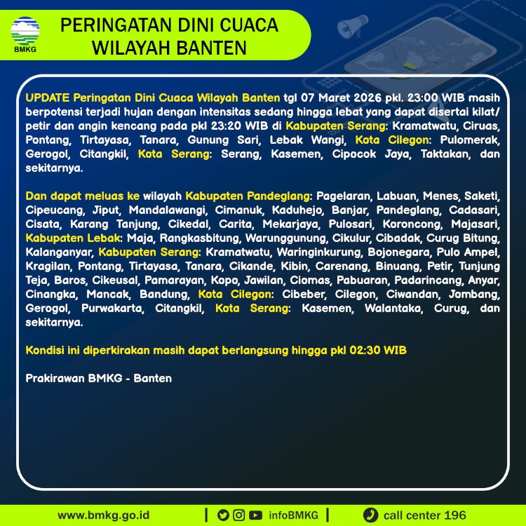 UPDATE Peringatan Dini Cuaca Banten tgl 7 Maret 2026 pkl 23:00 WIB masih berpotensi terjadi Hujan Sedang-Lebat yang dapat disertai Kilat/Petir dan Angin Kencang pada pkl. 23:20 WIB di